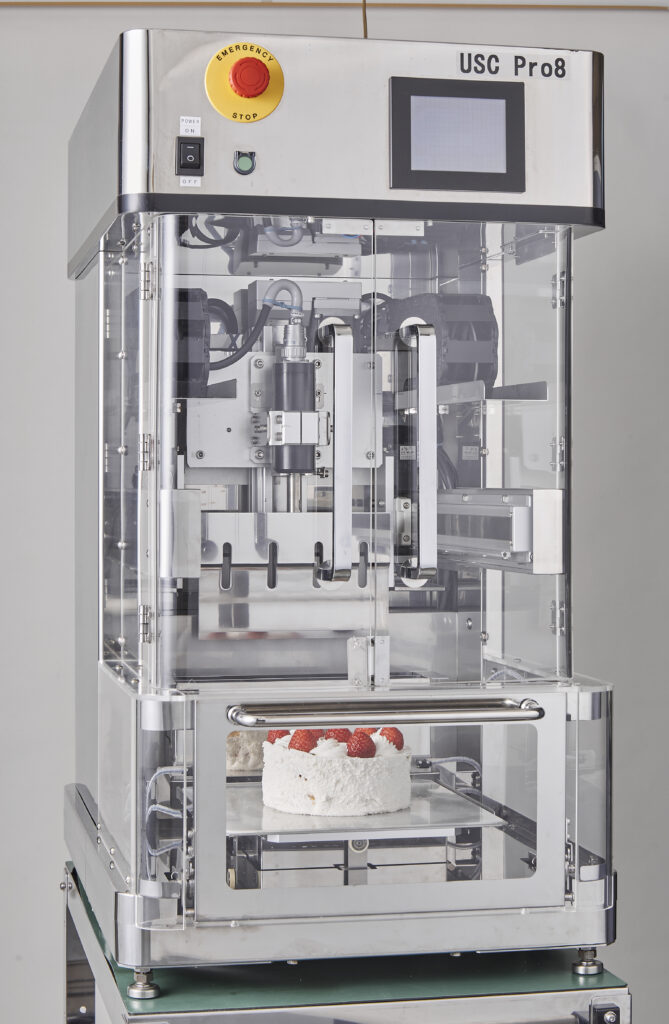 そこでフルハートジャパンでは、街のケーキ店用のケーキカッターでは、ケーキの投入は人間が手で行う一方、カッターの位置制御には高度なサーボモーターを採用、刃は取り外しての丸洗いが容易な設計を採用しました。